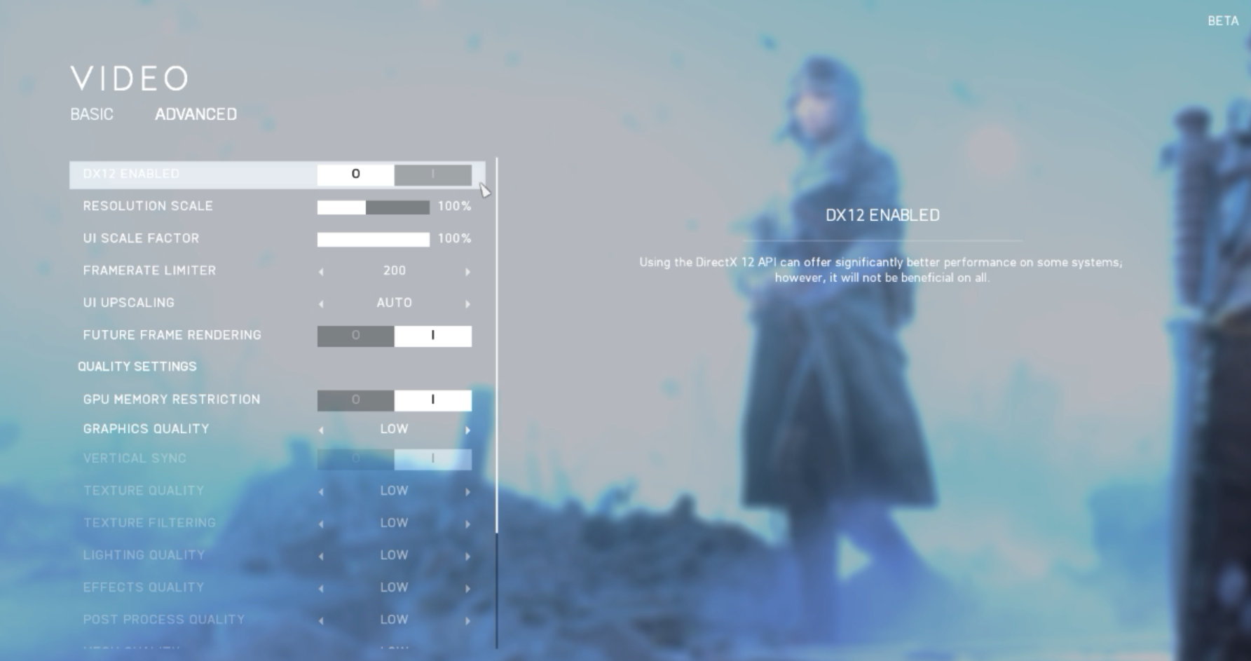操作手順:OPTIONS – VIDEO – ADVANCED – DX12 ENABLED